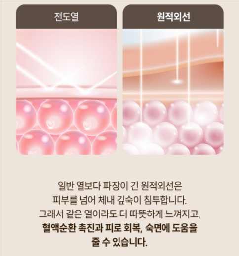 | 난방감 | 원적외선 복사열로 몸속 깊숙이 따뜻함. 열 분포가 균일하고 쾌적함. | 열선 주변이 뜨겁고, 몸의 일부분만 따뜻하게 느껴질 수 있음. |