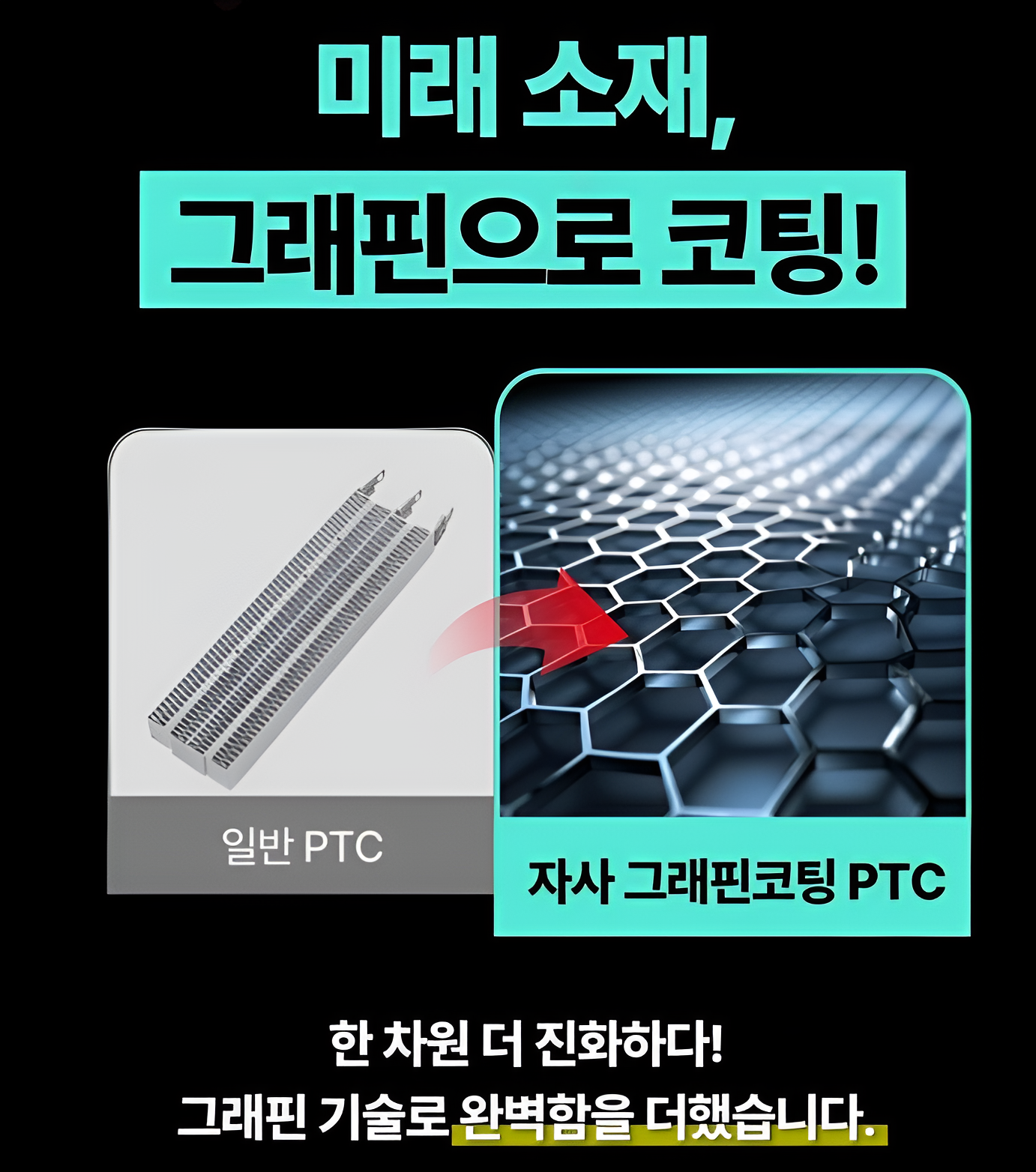 | 발열 원리 | 세라믹 소재가 스스로 온도를 제어하며 발열 (과열 차단 기본) | PTC에 꿈의 신소재 그래핀을 코팅/적용 (열전도율 극대화) |